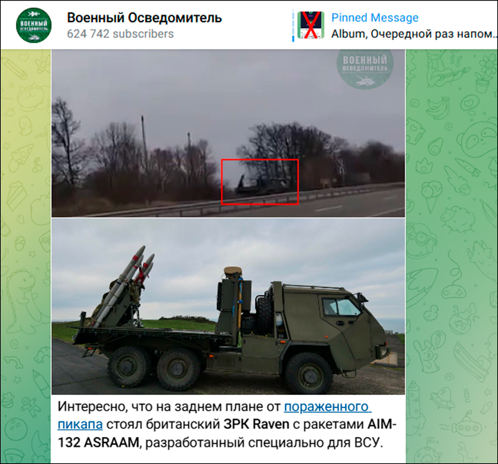 Осинтеры отметили: в данном конкретном случае украинцы ещё дёшево отделались – "Герань" или "Гербера" (этот вариант тоже не исключён) атаковала и уничтожила пикап с зенитным пулемётом, хотя рядом с ним, буквально в нескольких десятках метров, была намного более "жирная" цель – британский ЗРК Raven, созданный уже в ходе СВО специально для борьбы с русскими дальнобойными беспилотниками и крылатыми ракетами.