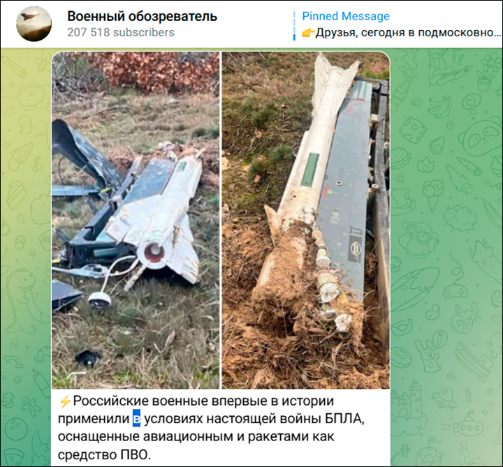 Чуть позже украинские каналы обнародовали видео перехвата нашей "Герани" украинским зенитным дроном, на кадрах которого запечатлено, что наш беспилотник вооружён авиационной ракетой Р-60.