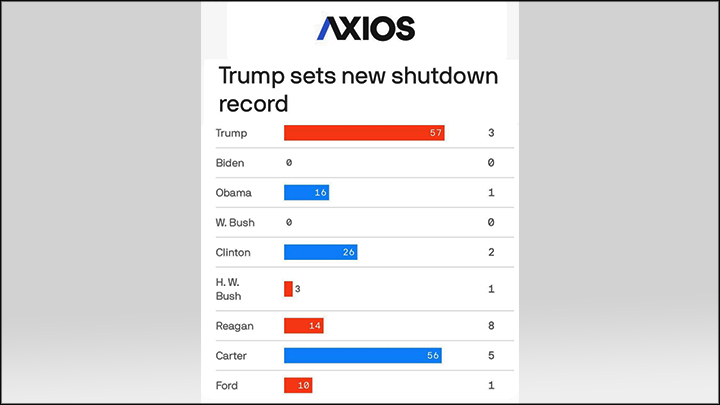 Трамп установил новый рекорд по продолжительности шатдауна, побив рекорд Картера: при нём США провели рекордные 57 дней в режиме шатдауна. Скриншот: Axios