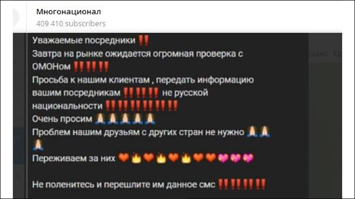 Вот такие рассылки расходятся по "Садоводу" перед рейдами правоохранителей. Скриншот: телеграм-канал "Многонационал"