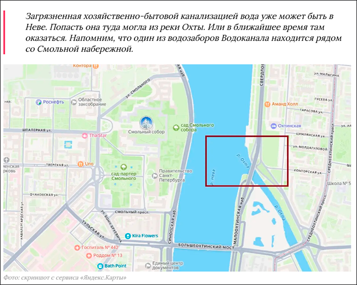 Всё зависит от того, где именно Охта впадает в Неву. Если ниже точки водозабора, то канализационные стоки просто смоет в Финский залив — и она там растворятся. Это плохо, но не смертельно. А если впадение Охты в Неву выше водозабора, то очистным сооружениям придётся с загрязнениями усиленно бороться, чтобы в краны питерцев не попала отравленная вода,