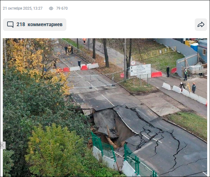 Провал на перекрестке 1-го Муринского проспекта и улицы Харченко, сайт издания "Фонтанка", скриншот страницы от 21 октября