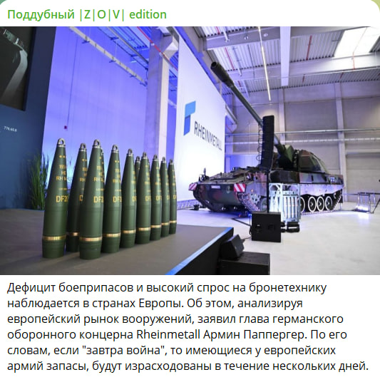 Немецкий оборонный концерн Rheinmetall готовится беспрецедентно нарастить количество выпускаемых артиллерийских боеприпасов из-за критического дефицита в Европе, о чём заявил глава компании Армин Паппергер. По его словам, если "завтра война", то имеющиеся у европейских армий запасы будут израсходованы в течение нескольких дней.