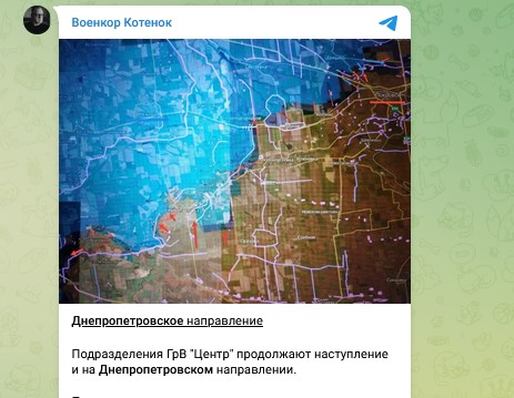 Тем временем трещать и рваться начало на "неприкосновенном" направлении. Ещё буквально около года назад из Киева, в ответ на тревожные сигналы от украинских военкоров и боевиков, звучали бодрые опровержения о возможности захода русских войск в Днепропетровскую область. Утверждалось, мол, направление "неприкосновенно", потому что защищено от и до, как говорится. И вот уже сегодня ситуация развивается настолько стремительно, что украинский Генштаб теперь уже, вероятно, не успевает настроиться на то, чтобы сообщить всю правду о катастрофе для ВСУ. Что же там происходит? Как сообщает военкор Юрий Котенок, подразделения ГрВ "Центр" продолжают наступление на Днепропетровском направлении.