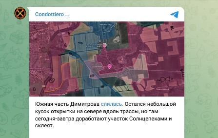 Ситуация в Мирнограде (Димитрове) начинает стремительно развиваться – и совсем не в пользу противника. По данным военкора Анатолия Радова, на сегодняшний день "юг Мирнограда всё".