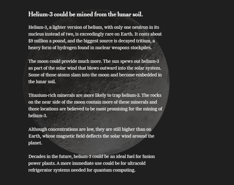 А вот на Луне это вещество в изобилии. Термоядерные реакции в недрах Солнца производят гелий‑3, который солнечный ветер разносит по Солнечной системе. Часть атомов оседает в лунном грунте - особенно в богатых титаном минералах на ближней к Земле стороне спутника.