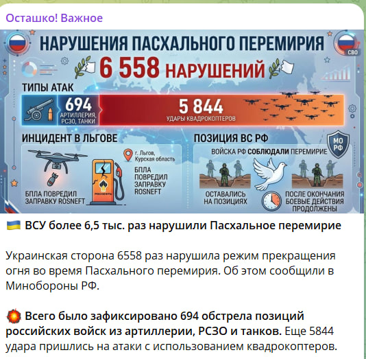 По заявлениям противника, ВС России 2299 раз нарушили перемирие. Сообщений об атаках с нашей стороны от врага не поступало. Вывод: [ВСУ] попытались использовать перемирие в целях продвижения и захвата территорий, но 2299 раз получили по [голове] и успокоились,